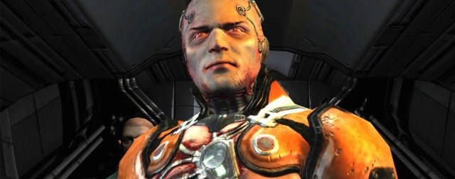 La guerra contra los Strogg va bastante bien hasta la mitad de Quake 4 , pero luego sucede algo terrible. Primero, las fuerzas Strogg capturan al personaje principal en un momento del que no podemos salir del evento QuickTime. Luego, llevan al personaje principal a sus instalaciones de Stroggificación y vemos todo el proceso. Es bastante gráfico.