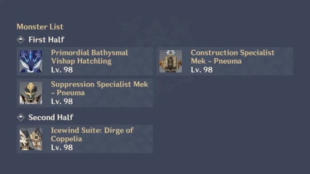 La primera mitad es una comprobación de DPS bastante sencilla. Intenta evitar ser golpeado por los Vishaps, ya que algunos de sus ataques drenarán la energía de tu personaje activo. Los equipos congelados son geniales para esta mitad.